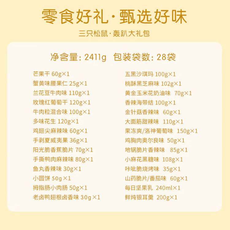 三只松鼠轰趴零食大礼包28袋2411g辣条肉脯休闲巨型送女友礼物送礼