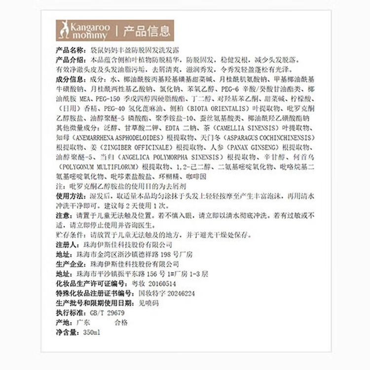 袋鼠妈妈洗发水控油蓬松去屑止痒侧柏叶生姜洗发露护肤品专用350ml
