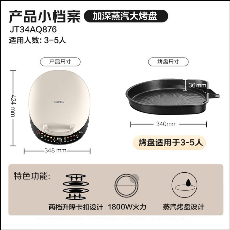 苏泊尔(SUPOR)电饼铛家用 双面加热 煎烤机烙饼锅煎饼铛36mm加深34cm加大升降烤盘 早餐机电饼档 JT34AQ876