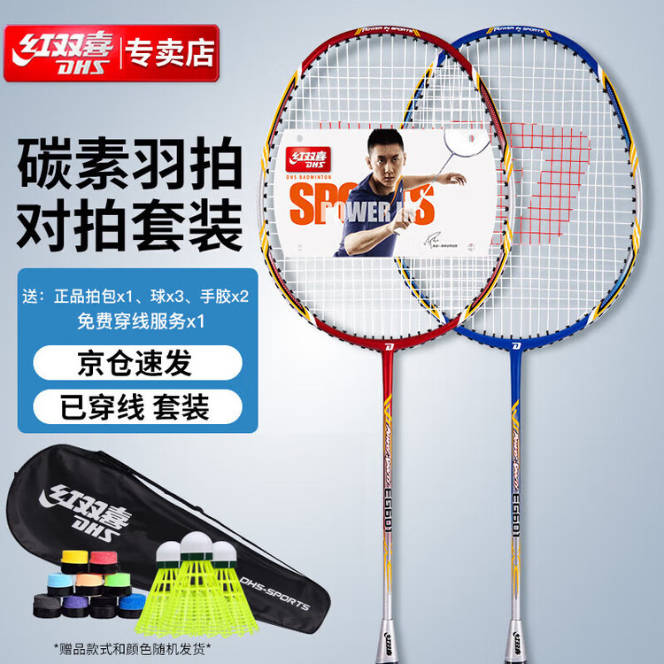 京东直供新 > 运动户外 >体育用品 >京东直供 >红双喜DHS羽毛球拍对拍2支碳素专业羽拍套装E-EG601羽球手胶